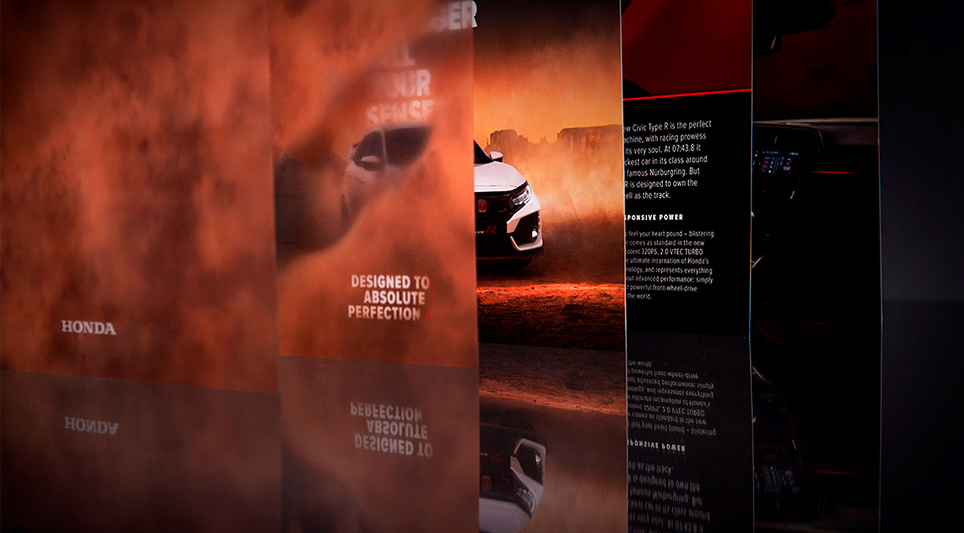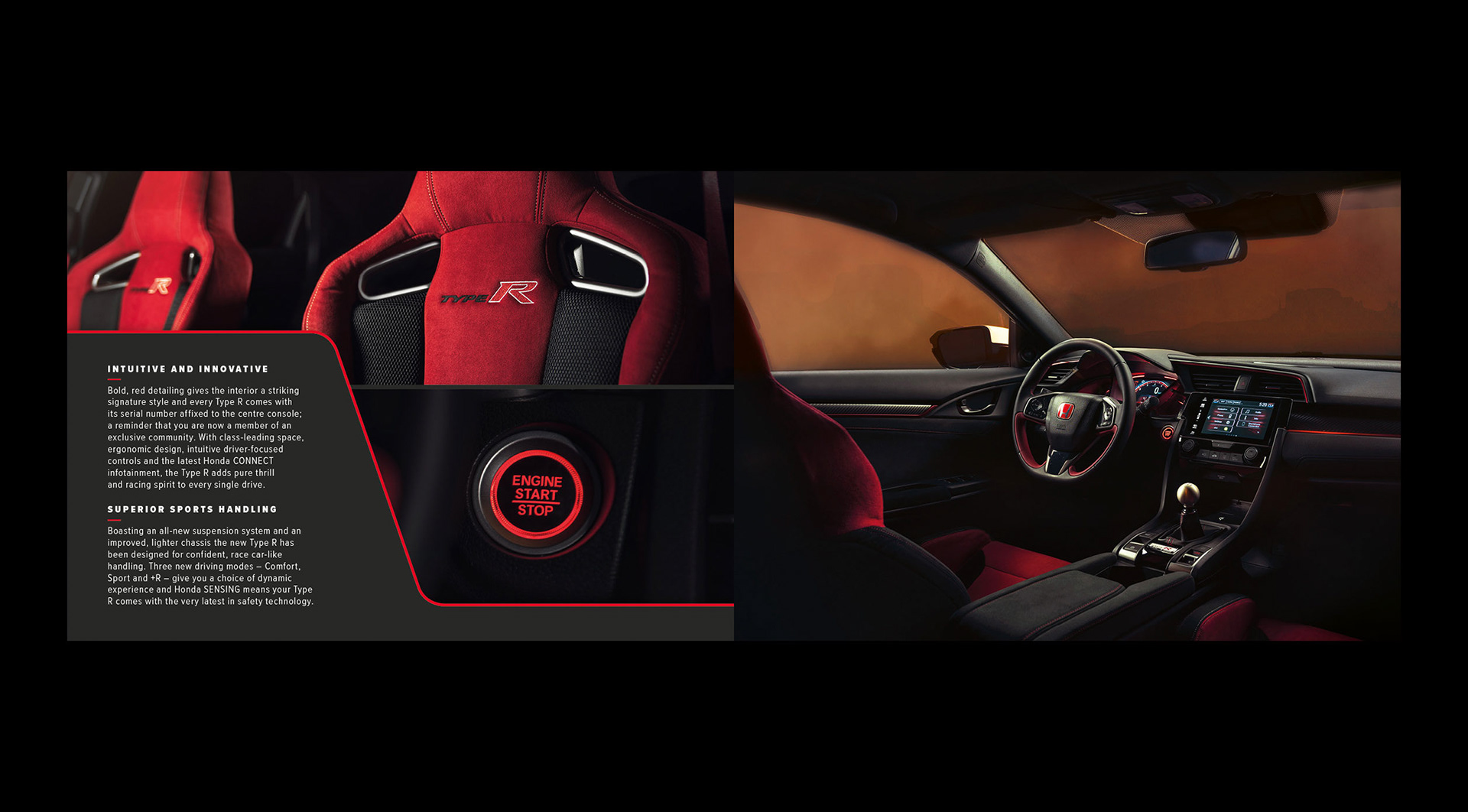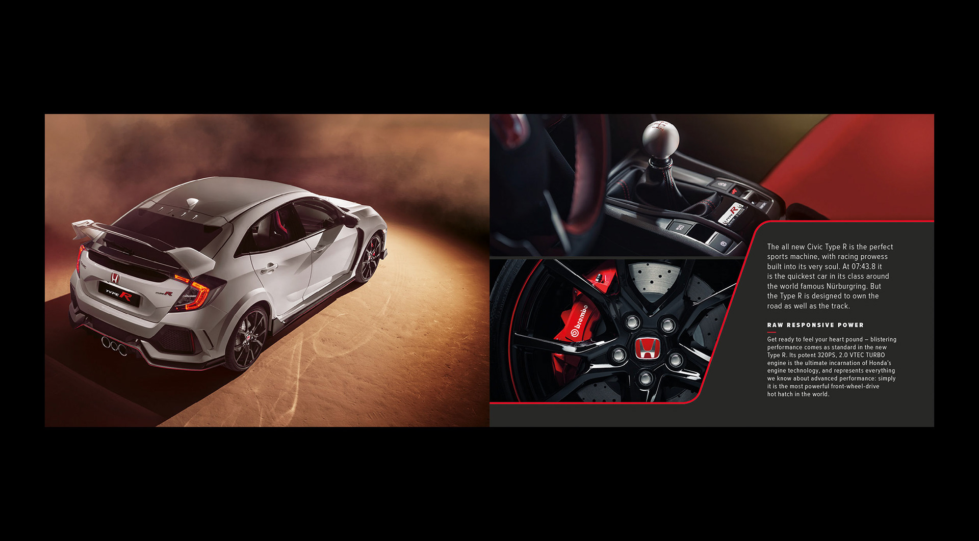 The client desired a direct mailer to create drama and suspension utilising the design language of sleek lines and colour accents found in the Type R.